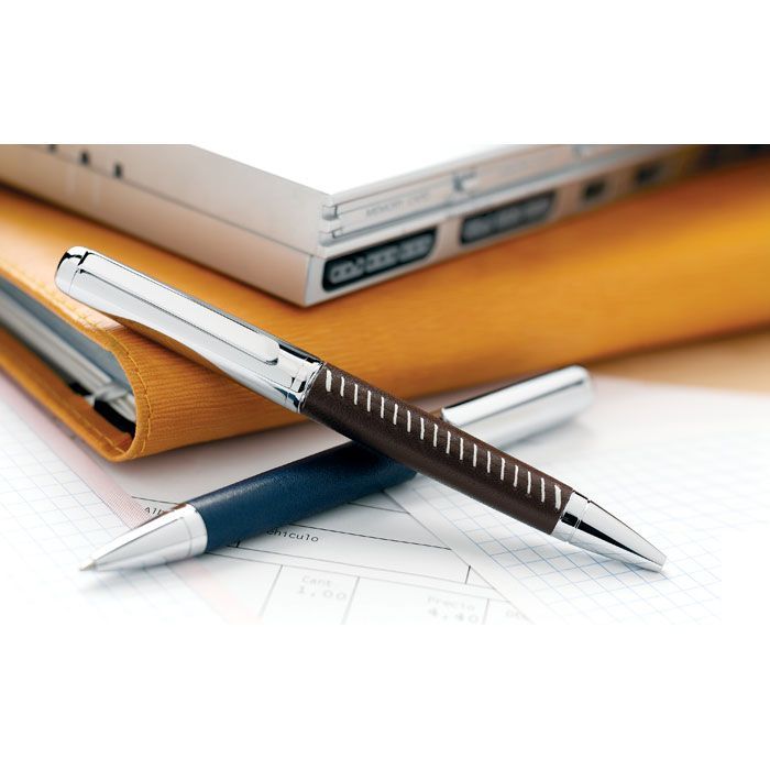 Bolígrafo metálico con acabado cromado plateado y aplicación en piel en caja de tubo de aluminio. Tinta negra.