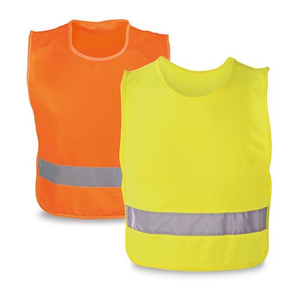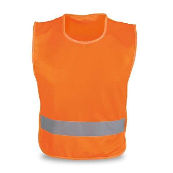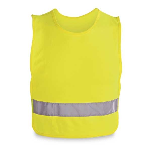 Chaleco reflectante para niños. 100% poliéster. Homologado EN1150. Con 1 banda reflectante horizontal. Cierre de velcro lateral. Producto no apto para uso profesional. Talla única: 370 x 470 mm