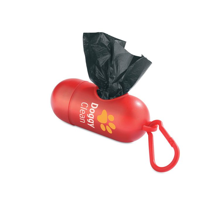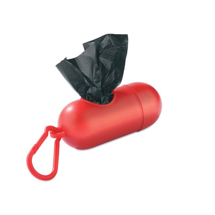Contenedor de bolsas (10) en forma cilíndrica con mosquetón. Varios colores.