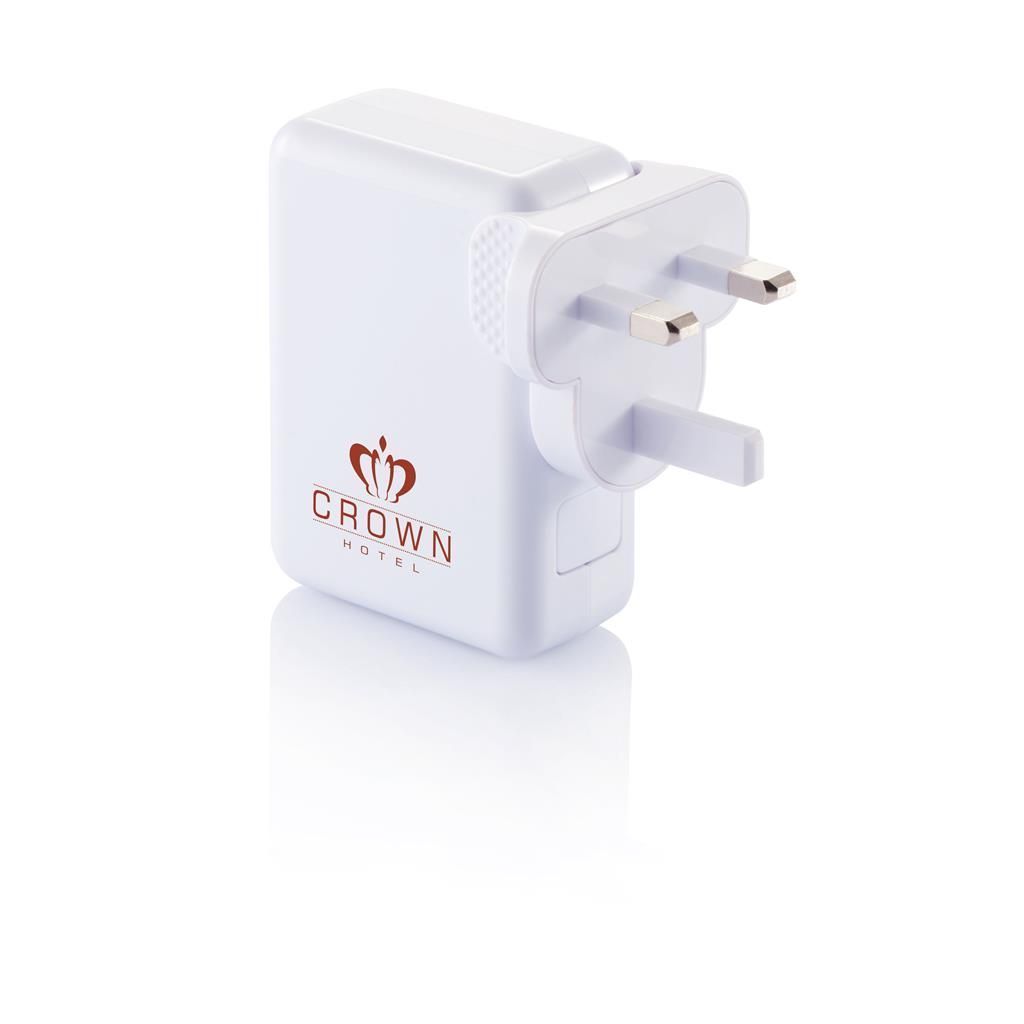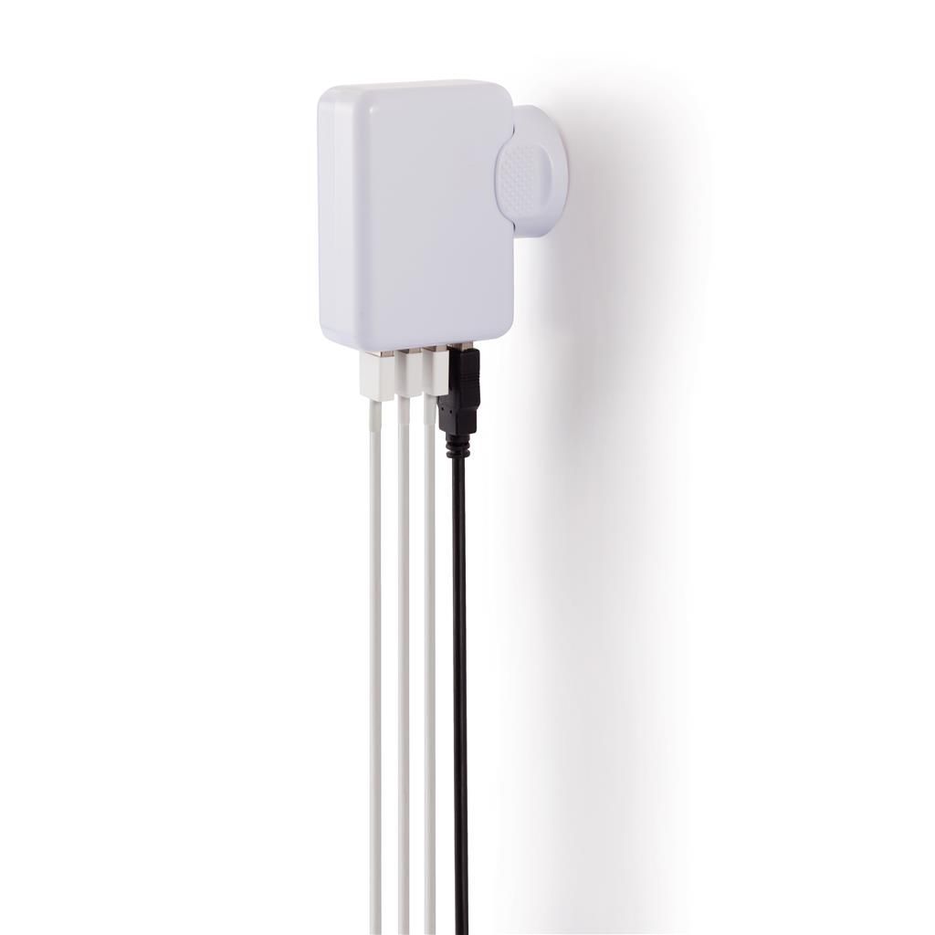 Enchufe de viaje portátil con 4 puertos USB para cargar todos tus dispositivos. La potente salida 3.1A te permite suficiente potencia para cargar todos tus dispositivos al mismo tiempo. AC Max 240V/350mA, USB Max 5.25V/3.1 mA DC. Incluye 4 enchufes diferentes. Presentado en estuche.