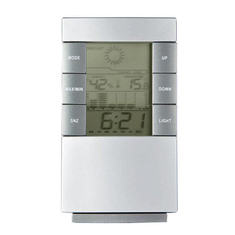 Estación meteorológica de plástico abs, con función reloj, alarma, calendario, termómetro, higrómetro, y previsión meteorológica. Para sobremesa y pared. Con opción marcaje Digital todo color. 2 pilas AAA incluidas.