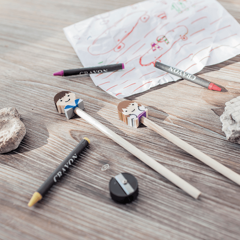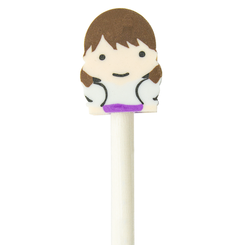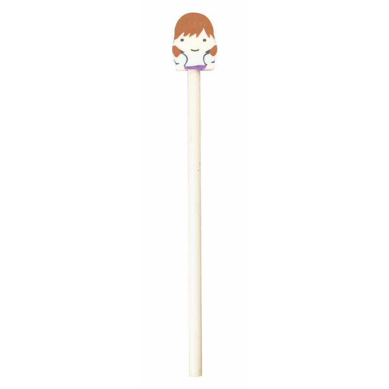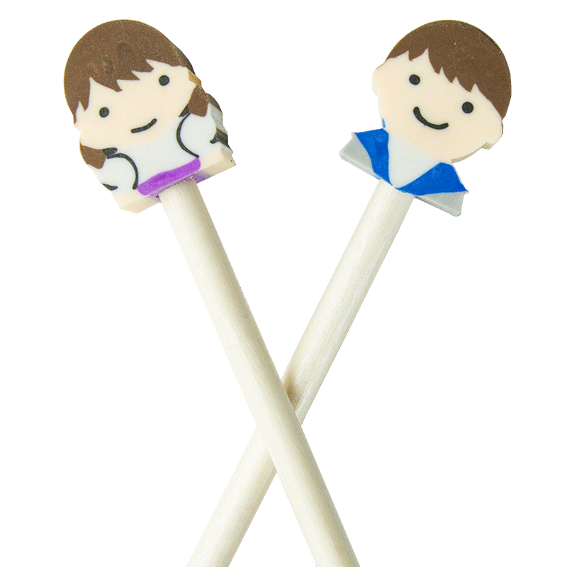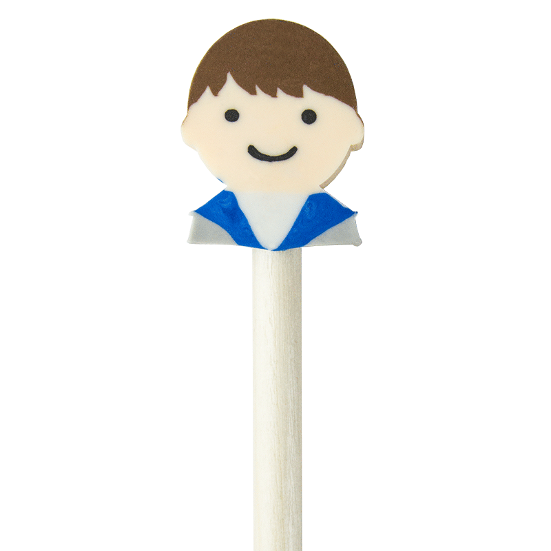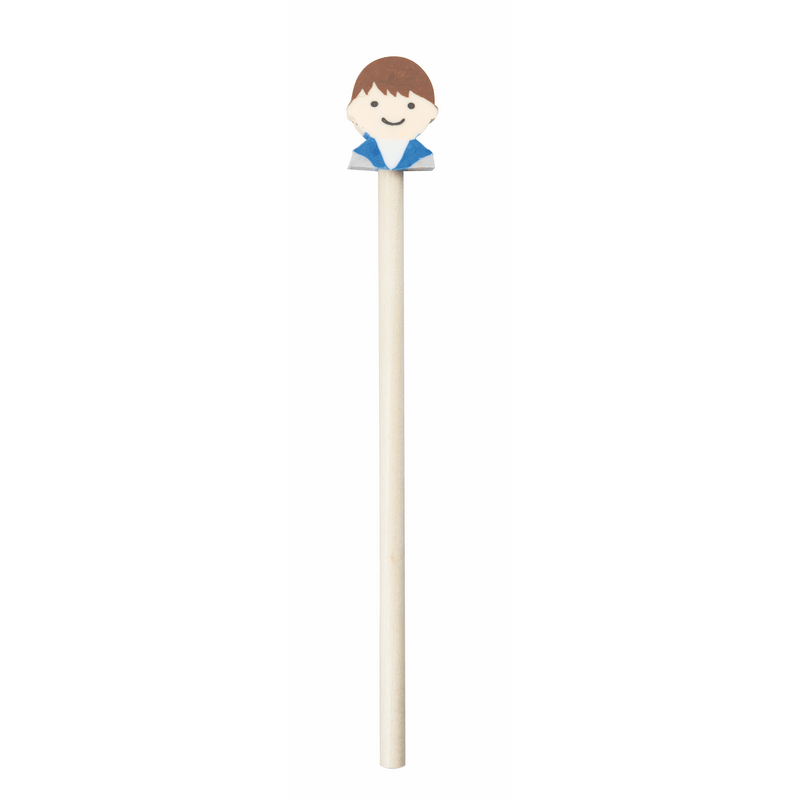 Lápiz de madera para niños. En la parte superior tiene una divertida goma de borrar en forma de niño o de niña.