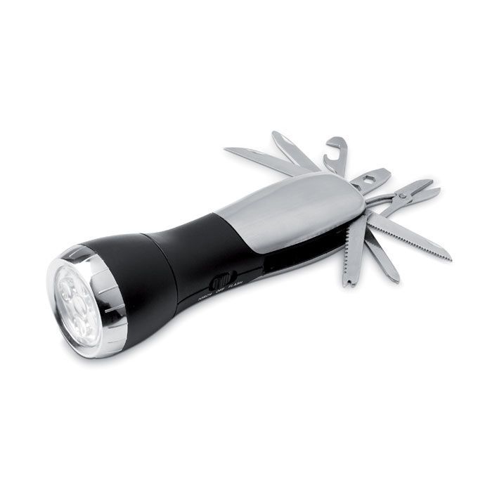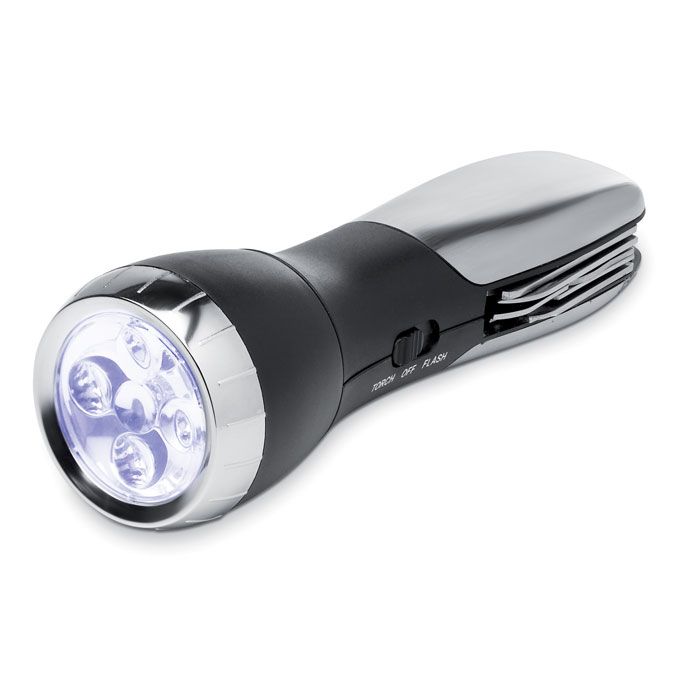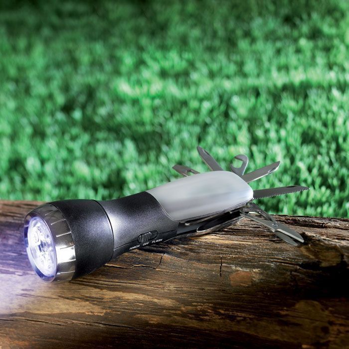 Linterna multiusos con 4 LED de luz blanca y 1 LED de luz roja para casos de emergencia. Incluye 8 herramientas multiusos. Material ABS con acero inoxidable. Funciona con 3 pilas AAA no incluidas.