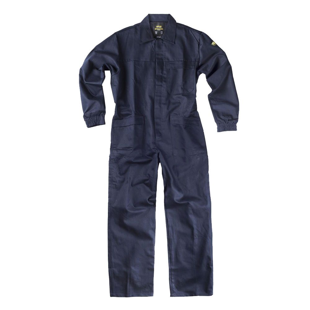Buzo ignífugo y antiestático con cuello camisero y canesú delantero. Cierre de cremallera de metal de doble tirador oculta y velcro. Un bolso de pecho de plastón con cremallera metálica y cartera de seguridad. Dos bolsos en los costados y un bolso trasero, todos de plastón sin cierre y con cartera de seguridad. Dos bolsos de espátula. Puño con elástico. Elástico en la espalda.