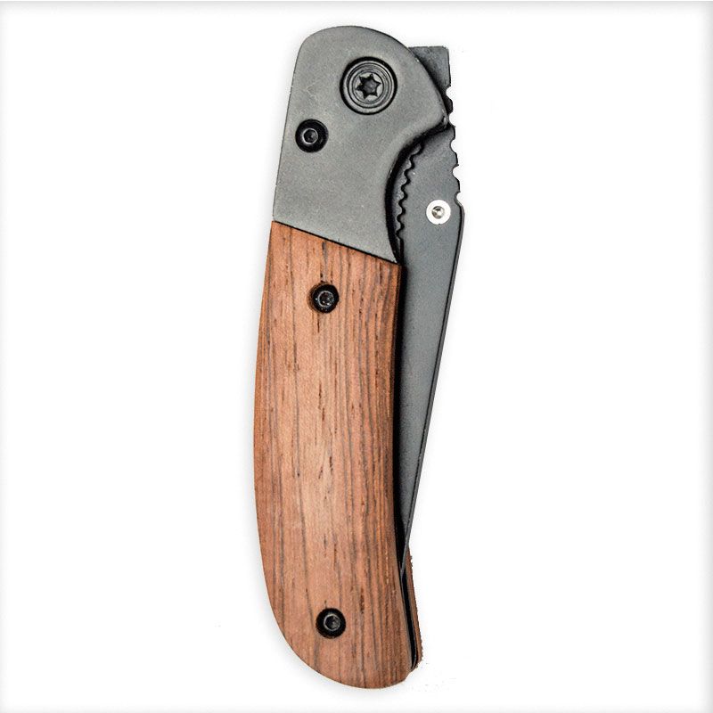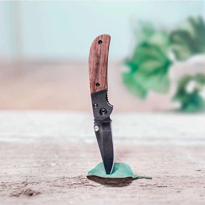 Navaja de una sola utilidad con mango de madera y filo de acero inoxidable de color negro. Presentación en caja de cartón forrado negro.