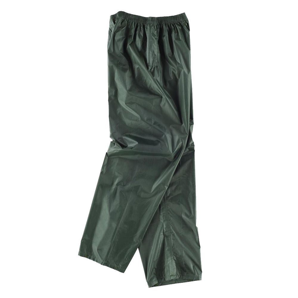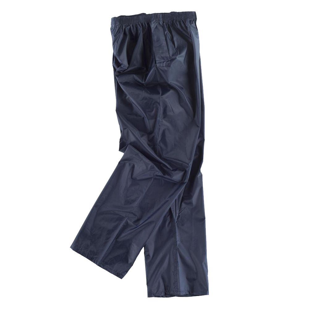 Pantalón impermeable con cintura elástica. Aberturas laterales de acceso al interior. Bajo ajustable con corchetes.