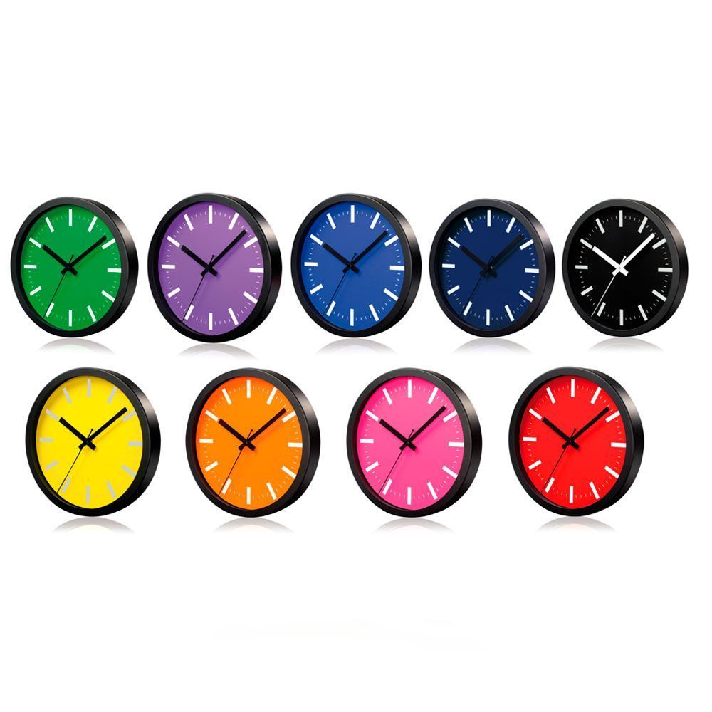 Reloj de pared con un marco de aluminio anodizado negro y una cubierta de vidrio. Está disponible en 10 colores. Las puntas son en blanco y negro, claramente visibles y el logotipo del cliente será extremadamente claro. Los relojes son muy estéticos y se adaptan bien al interior de la oficina y del hogar. El reloj está equipado con un mecanismo de movimiento de cuarzo silencioso, que prop