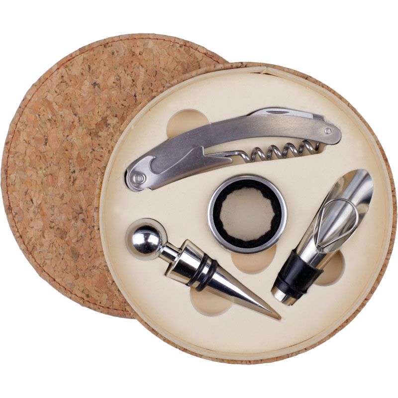 Set de vino de 4 piezas, presentado en un estuche de corcho, una nueva forma de ver a un producto clásico y cada vez más en boga.