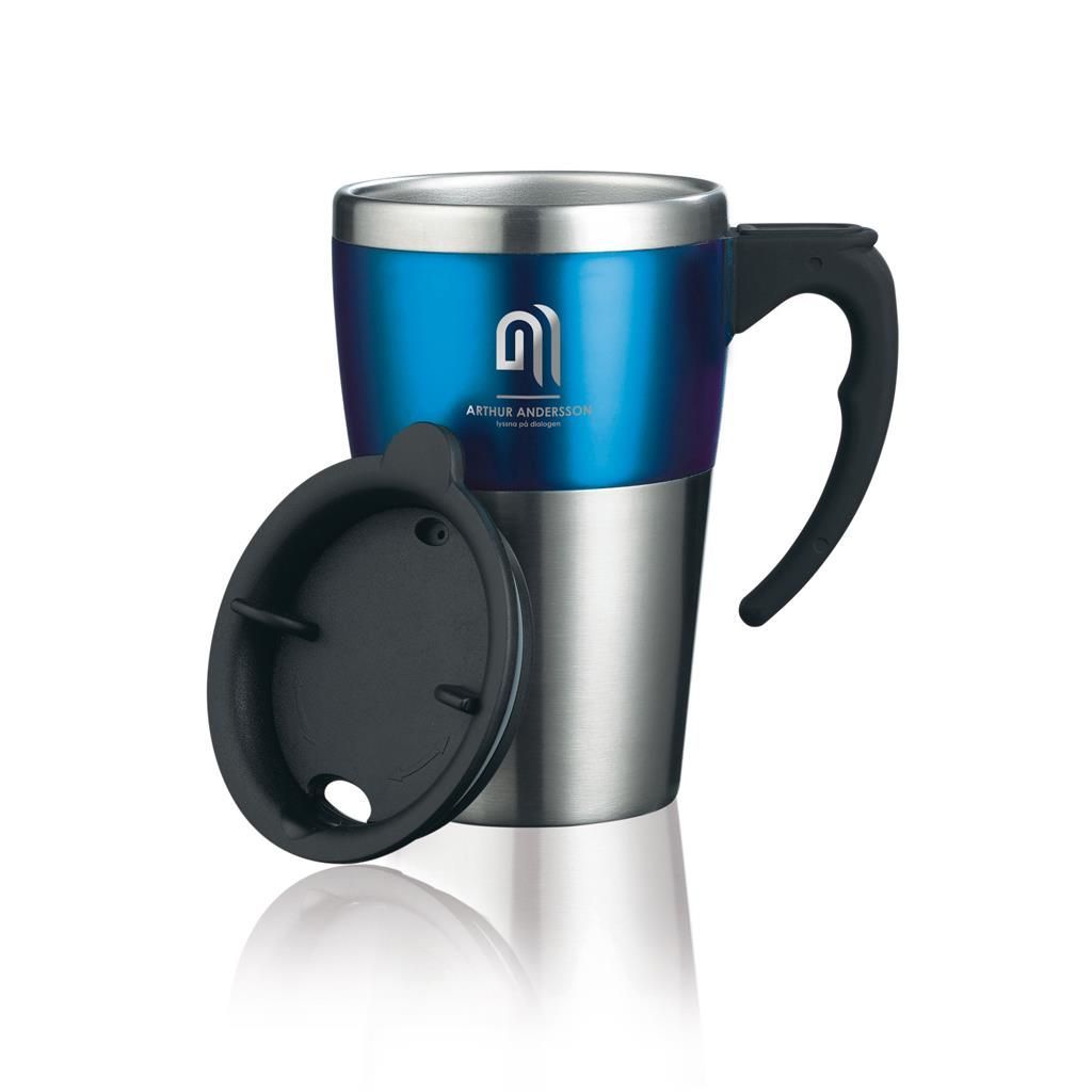 350ml, taza de acero inoxidable de doble pared con asa, tapa y detalle de color en ABS.